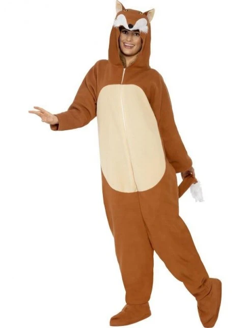 The Adult’s Fox Onesie Costume includes a light brown all in one jumpsuit with a lighter cream ‘belly’. This Unisex Fox Costume has an attached hood with a Fox’s face and ears and an attached tail with a white furry tip. The comfortable front zip fastening makes it very comfortable for both men and women.