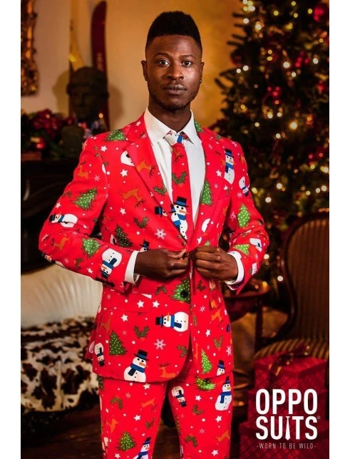The Christmaster Opposuit is a fully fitted red suit with Christmas patterns printed onto the suit. Included is a Christmaster Jacket with matching Trousers, and to complete the look is a tie in the matching Christmas Print pattern. There are snowmen, Christmas trees, stars and Reindeer on a red background, making this a great suit costume to wear for Christmas time!