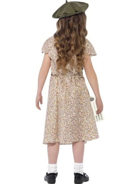 The Child’s Evacuee Girl Costume comes with a multi-coloured Patterned Dress with Green collar, mock green belt and green buttons, a Satchel Bag, ID Tag and Green Beret. Does not include Shoes or Socks.