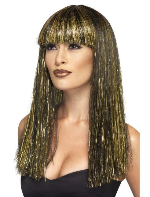 Womens Egyptian Goddess Wig, Black, with Gold Tinsel.