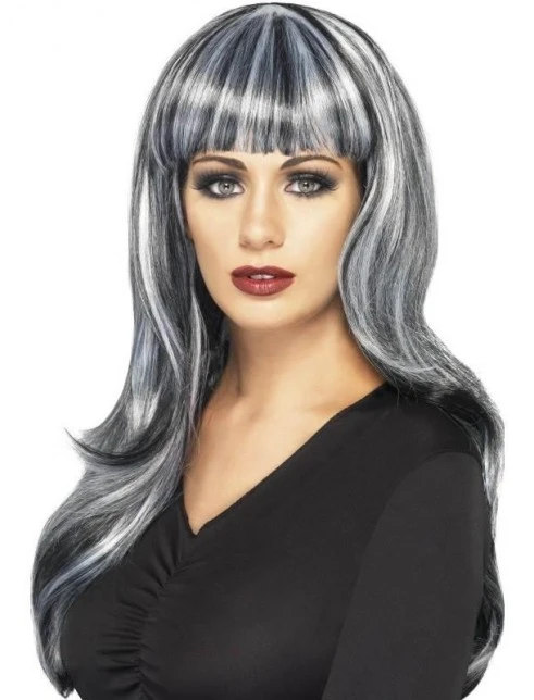 Sinister Siren Wig, Black, Long, Wavy with Fringe and Grey Streaks