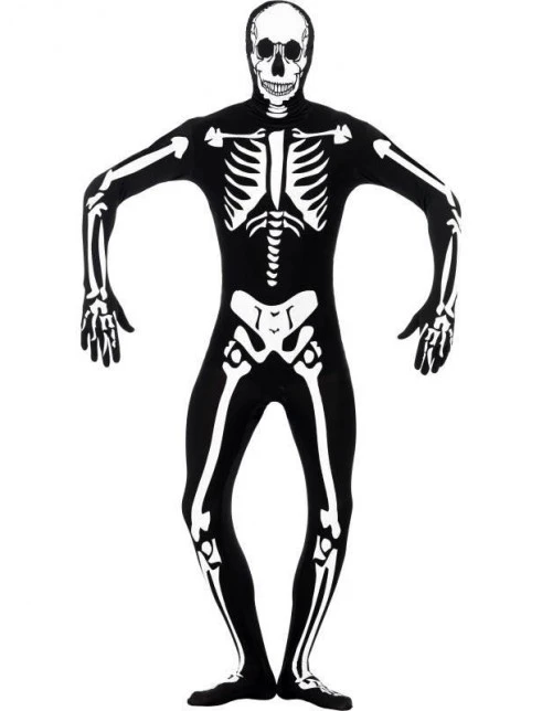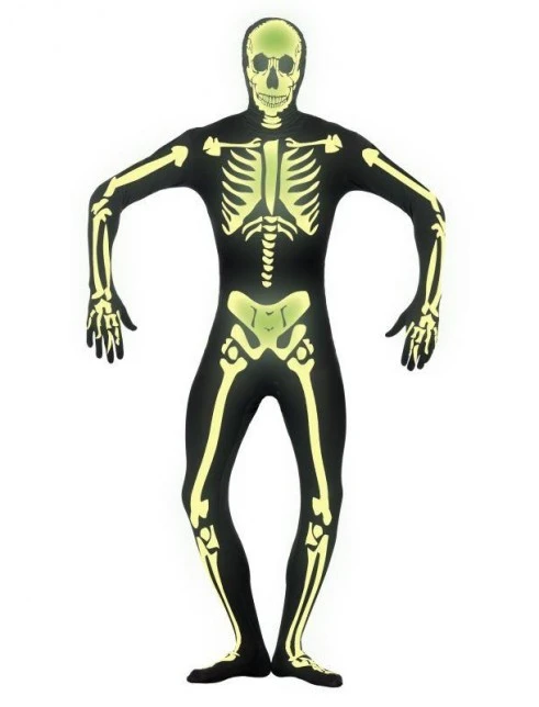 The Skeleton Glow in the Dark Second Skin Costume, comes with full one piece black bodysuit with a white skeleton printed onto the front. The print will also glow in the dark on this Mens Glow in the Dark Skeleton Costume, making you the scariest skeleton at the party! The Glow in the Dark Second Skin Costume, comes with a concealed fly and Under Chin Opening, so you can carry on drinking at the Halloween party with your friends.