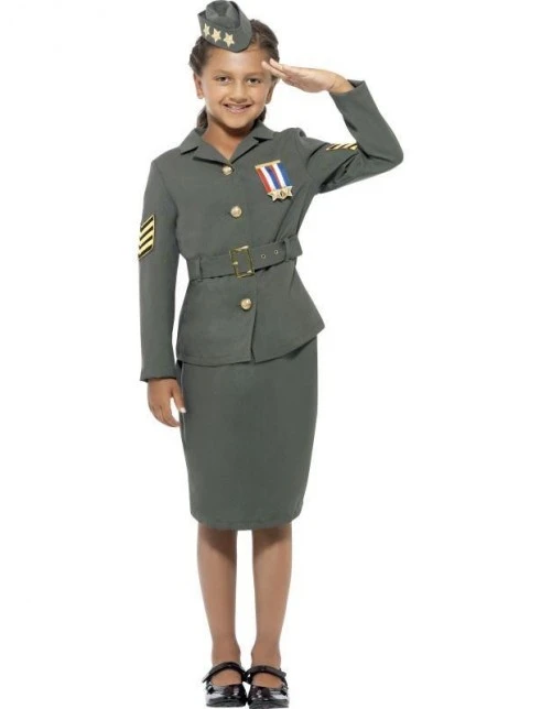 WW2 Army Girl Costume, Khaki Green, with Jacket, Skirt, Attached Belt and Hat